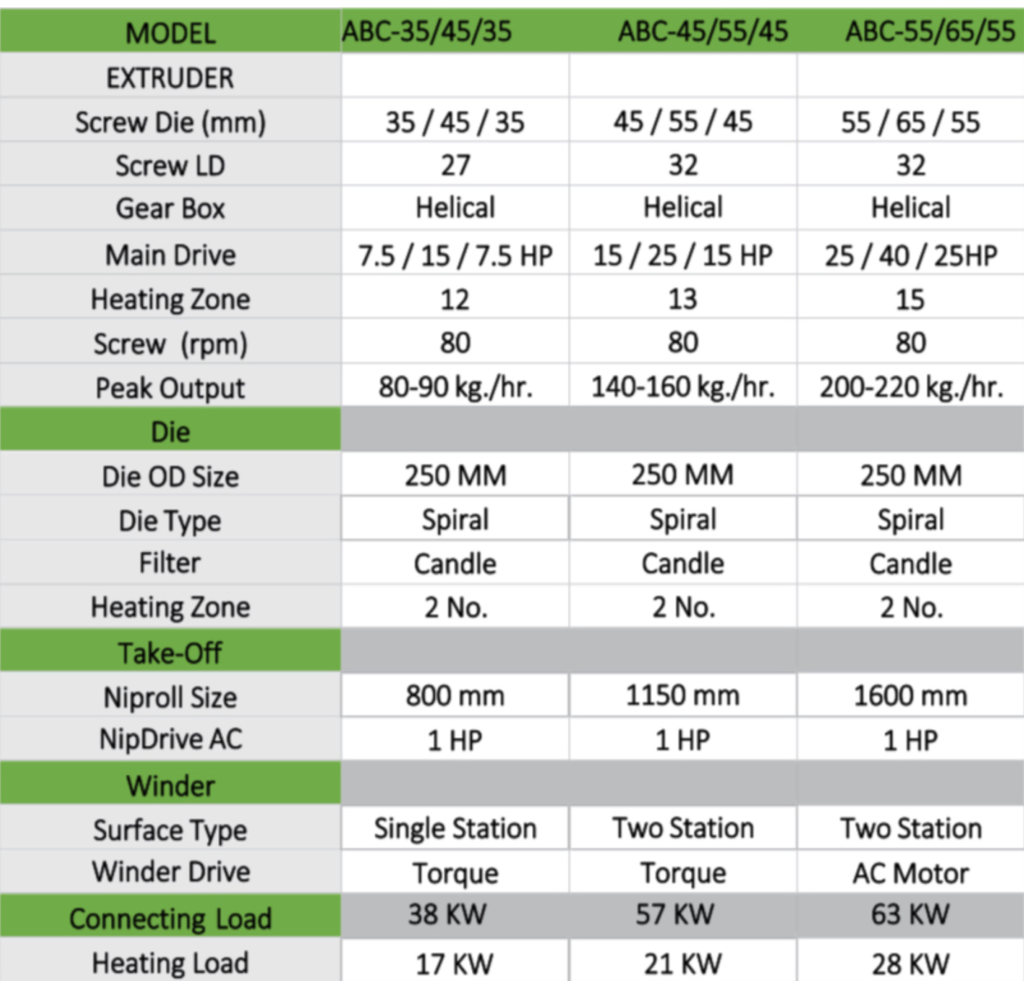 The ABA three-layer co-extrusion production line of blown film machines made by Vikas Industries can achieve more cost-effective, flexible, and energy-saving manufacturing applications. The lower cost of production materials gives the ABA three-layer co-extrusion blown film machine production line ongoing competitive advantages.